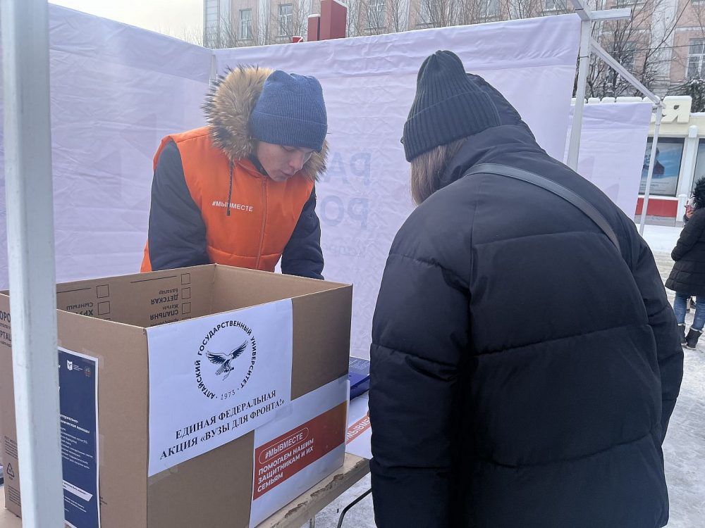 Алтайский государственный университет принимает участие в акции «Вузы для фронта» с 2024 года. Однако штаб помощи бойцам специальной военной операции начал работу на базе центра развития добровольчества АлтГУ с 2022 года, практически с начала СВО. К сбору гуманитарной помощи активно включились сотрудники, преподаватели и студенты. Подробности на сайте АлтГУ